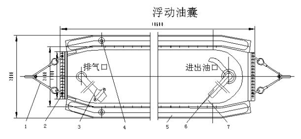 浮動(dòng)油囊由囊體、兩拖頭、兩根拖繩組成。囊體由高強(qiáng)度耐油橡膠布制成,由一個(gè)主儲(chǔ)油室、主儲(chǔ)油室二側(cè)的二個(gè)側(cè)氣室浮體構(gòu)成。拖繩可在水中拖帶油囊及起吊浮動(dòng)油囊(注意只有在油囊剩余的油少于3米3時(shí)才可以吊)。